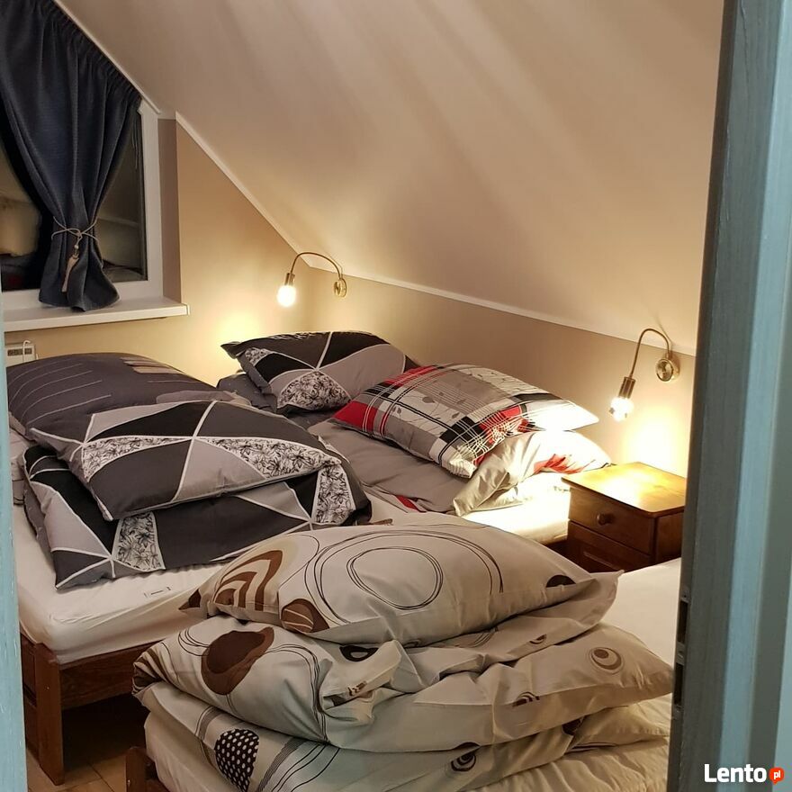 3 sypialnie z 9-mioma miejscami noclegowymi, oraz rozkładany komplet narożny na 2-osoby. Wszystkie łóżka posiadają wygodne materace i świeżą pościel, a także łóżeczko turystyczne dla niemowląt (bez pościeli).