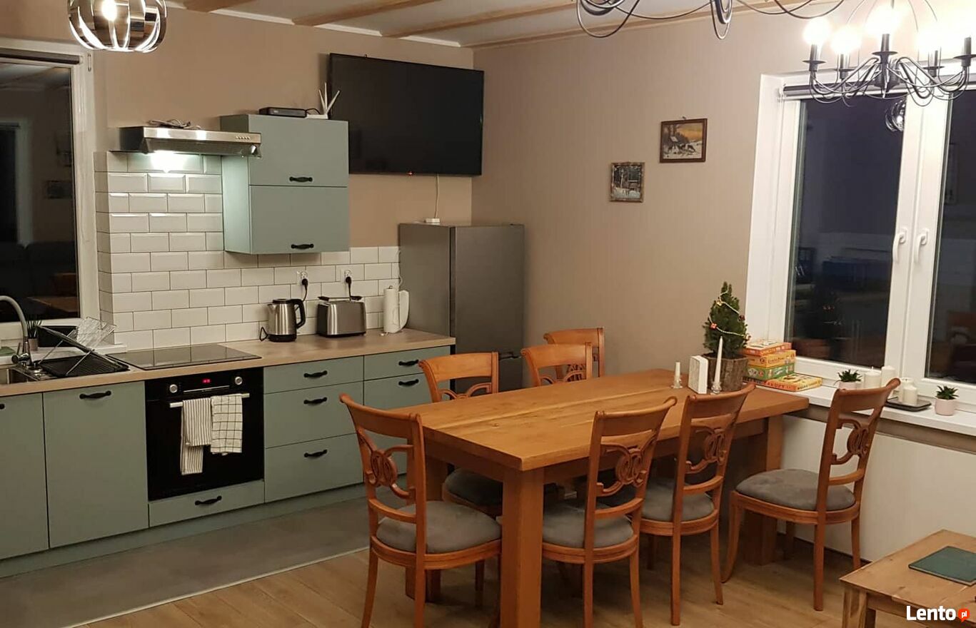 Wielki dębowy stół z 8-mioma krzesłami i szeroki narożnik z ławą oddaje pełny klimat i wygodę tego miejsca.
